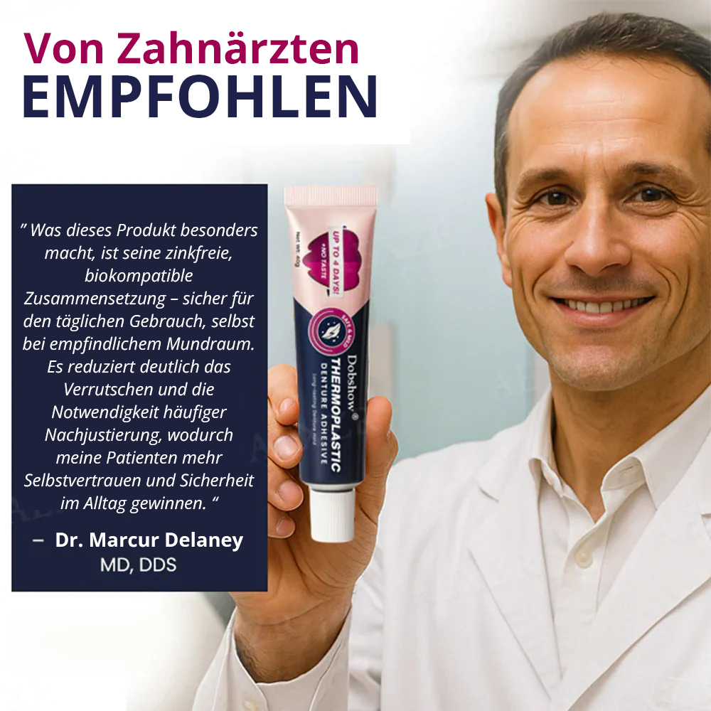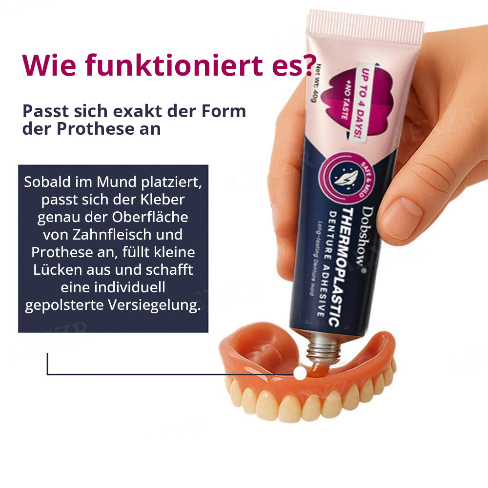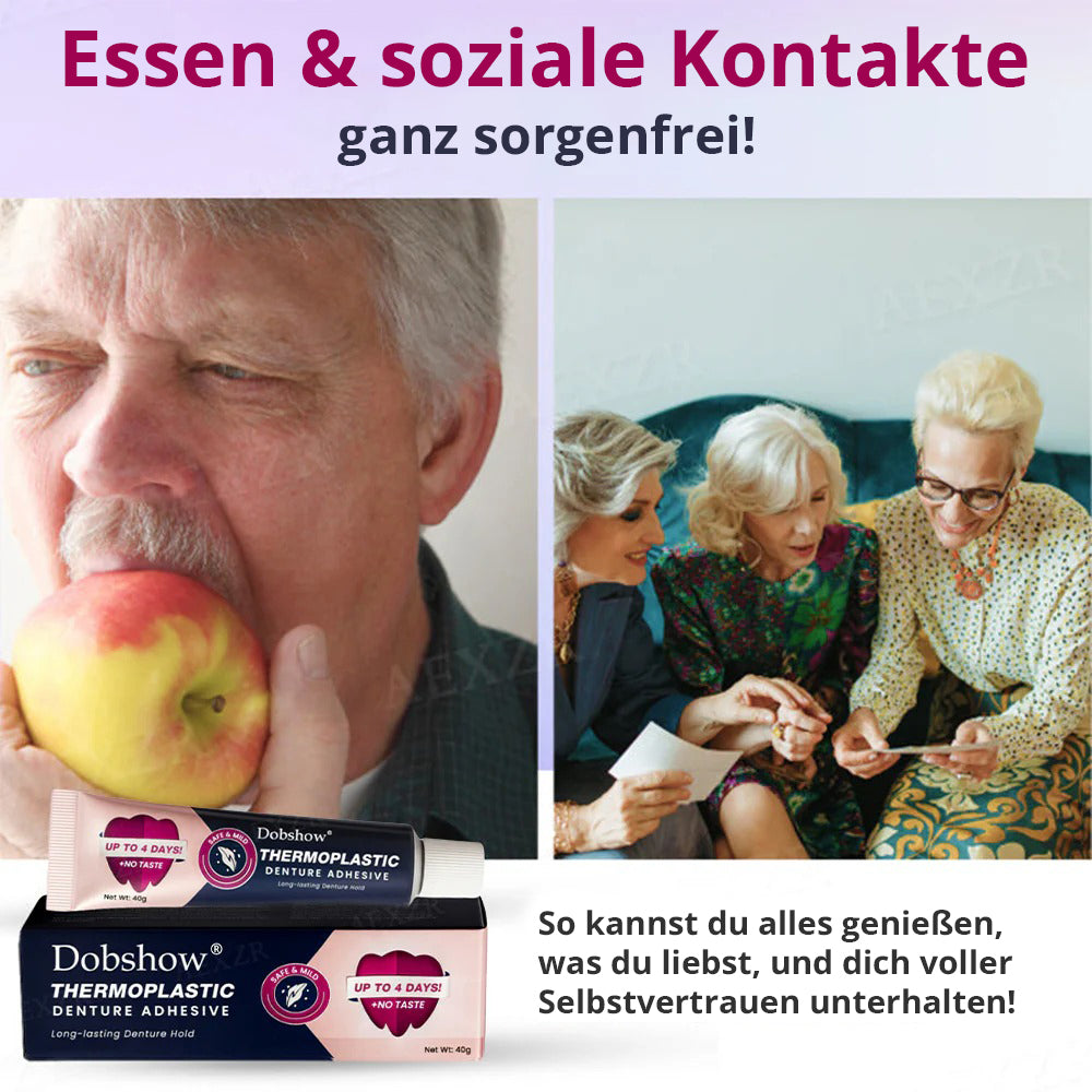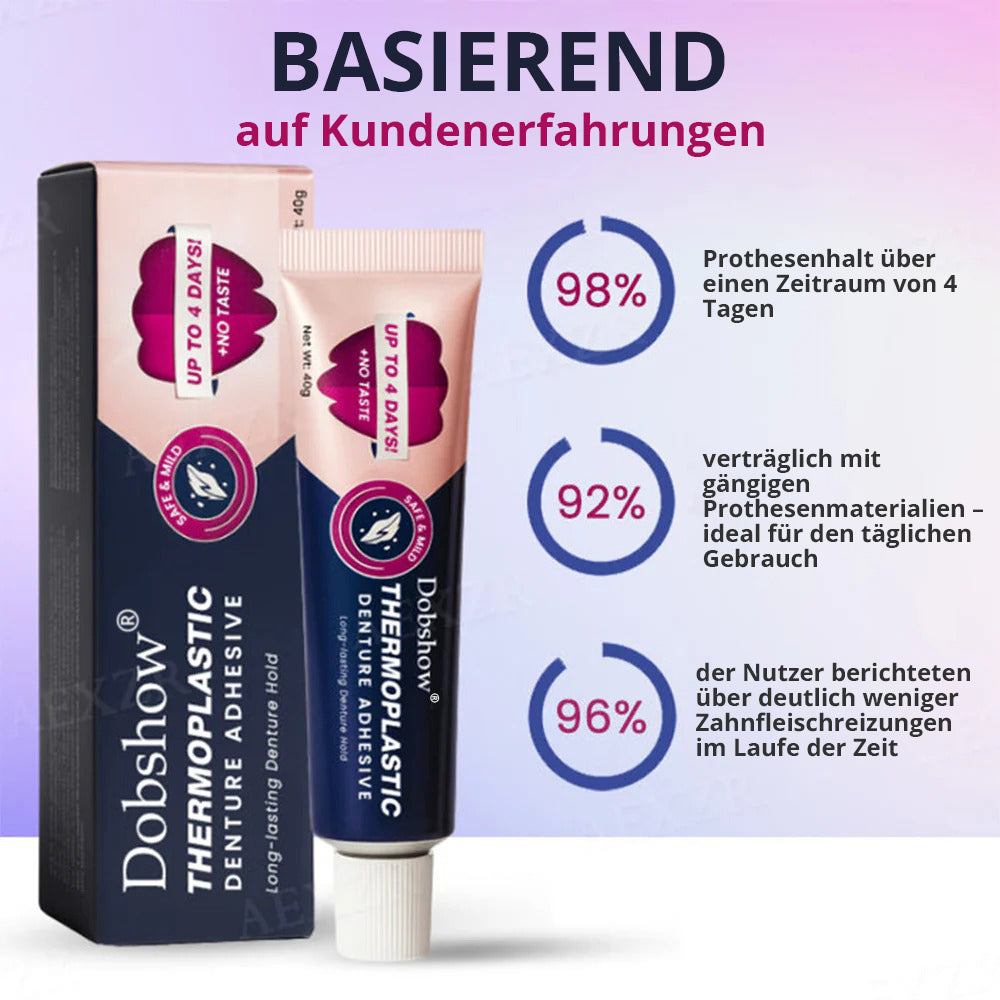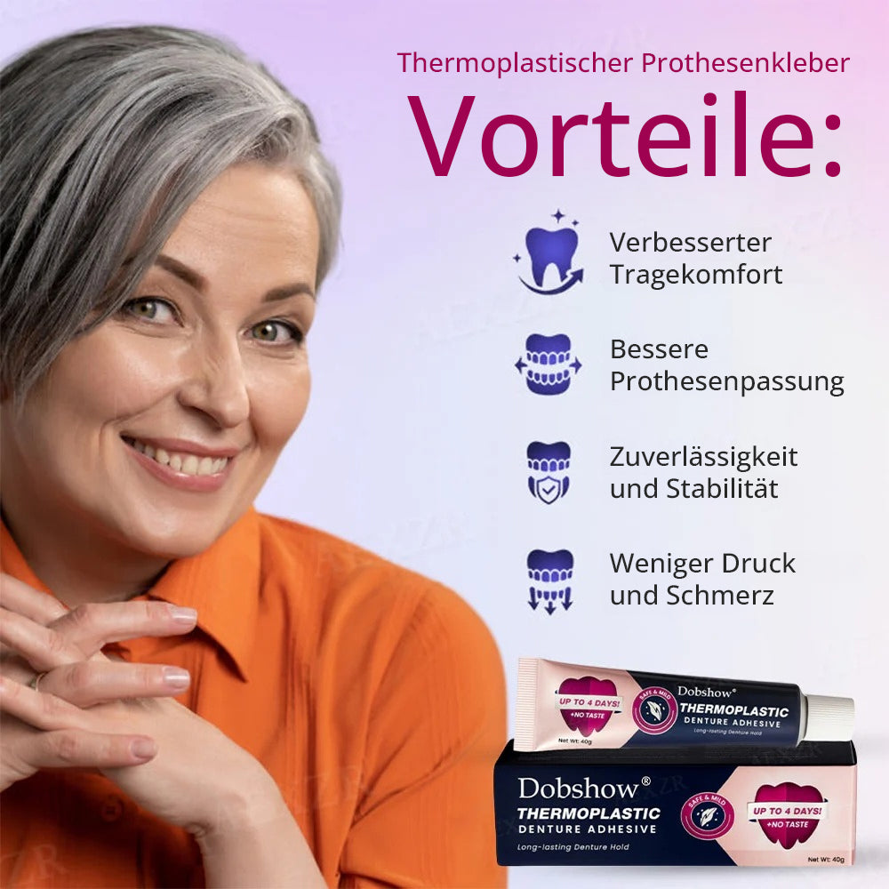 Deshalb haben wir Dobshow® Thermoplastischer Prothesenkleber entwickelt – eine moderne Lösung, die das Tragen von Zahnprothesen erleichtert. Unsere fortschrittliche, wärmeaktivierte Formel passt sich perfekt Ihrem Zahnfleisch an und sorgt für eine passgenaue Versiegelung, die Ihre Prothese bis zu vier Tage lang an Ort und Stelle hält. Kein Schmutz, kein Verrutschen und kein lästiges Lächeln mehr.