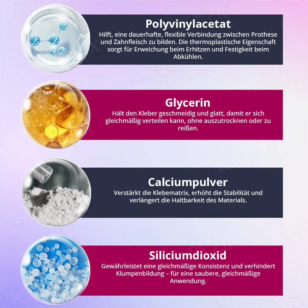 ein wichtiges Bindemittel, das für seine hervorragenden Hafteigenschaften bekannt ist. Es sorgt für eine dauerhafte, flexible Verbindung zwischen Prothese und Zahnfleischoberfläche. Dank seiner thermoplastischen Beschaffenheit wird es beim Erhitzen weicher und beim Abkühlen fester – so entsteht eine passgenaue Versiegelung, die mehrere Tage hält.